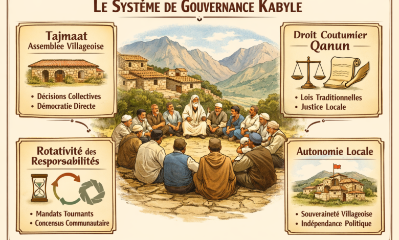 Lire la suite »Cet article analyse le système de gouvernance traditionnelle kabyle à travers l’institution de la tajmaat, une assemblée villageoise communautaire et…